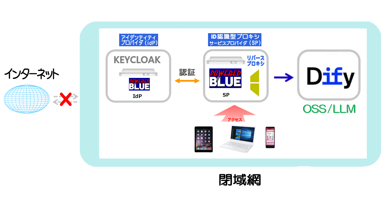 クローズドネットワークでのkeycloak連携で運用時の構成です。