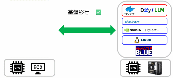 本製品は、自社で生成AIを管理運用できるセルフホストのDify‑Community Edition と LLM 実行環境を 1台のホストに統合した生成AI基盤です。Difyに加えてLLMも1台のホストで統合運用できます。