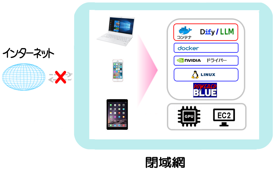 Dify-community版をdockerコンテナのセルフホストで運用。OSSのLLMもdockerのコンテナで運用する場合、自社データを外部へ出すことなくクローズドな環境での運用が可能です。また外部のLLMを使わない場合、LLMの費用は発生しません。