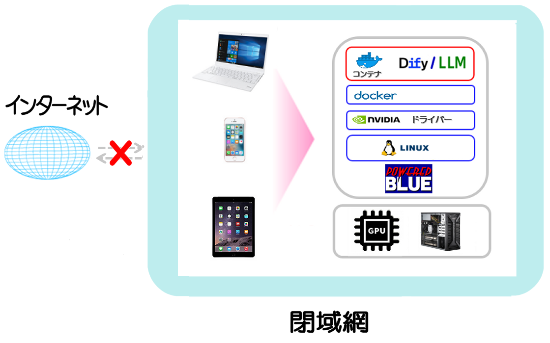 無償LLMをホスト上で直接稼働させる構成により、インターネット接続がない閉域網でも生成AIを構成できます。